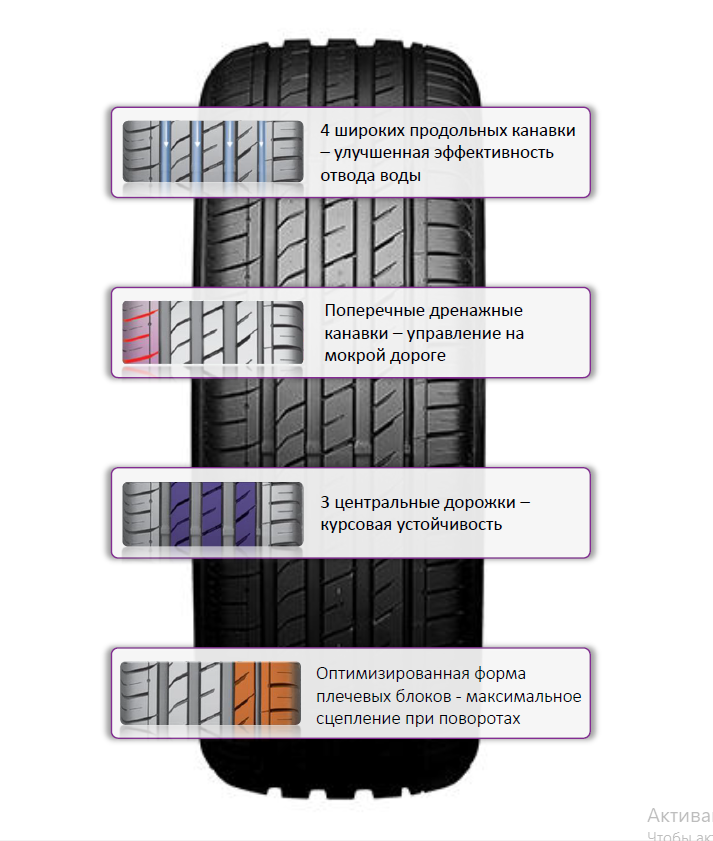 Продольные канавки (3 основных и 1 дополнительная) эффективно отводят воду из пятна контакта, снижая риск аквапланирования. Оптимизированные поперечные прорези улучшают сцепление как на сухом, так и на влажном покрытии.
